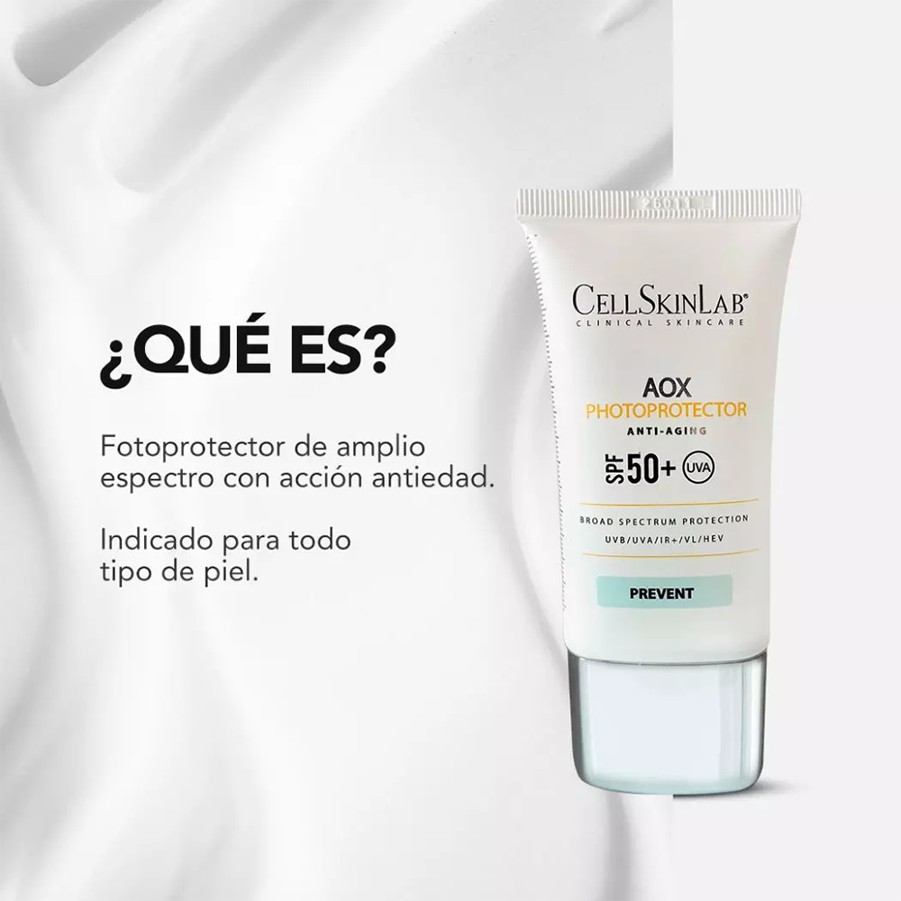 AOX PHOTOPROTECTOR SPF 50+ es un protector solar antiedad de muy alta protección, diseñado para ser el escudo indispensable en su rutina diaria de cuidado. Esta fórmula de última generación no solo protege contra la radiación UVB y UVA mediante filtros químicos como el Homosalato, Octinoxate, Avobenzona y Octisalato, sino que va más allá al disminuir los efectos dañinos de la Radiación Infrarroja (IR), la Luz Visible (LV) y la Luz Azul de Alta Energía (HEV).