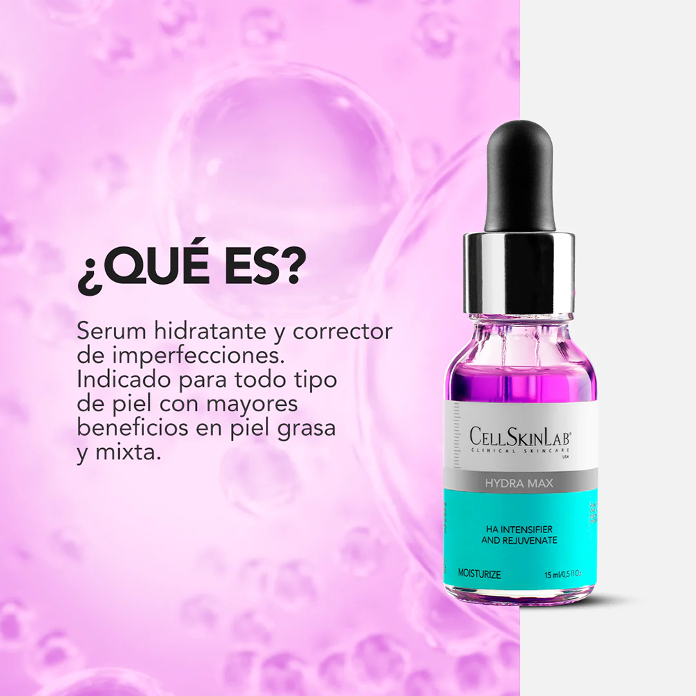 HYDRA MAX Sérum es un potente corrector de imperfecciones y un serum hidratante avanzado diseñado para transformar la apariencia de la piel, proporcionando suavidad, firmeza y un aspecto visiblemente más lozano. Su formulación innovadora actúa contra la sequedad, la flacidez y las arrugas, siendo un complemento ideal para potenciar y prolongar los resultados de tratamientos estéticos profesionales como fillers y mesoterapia.